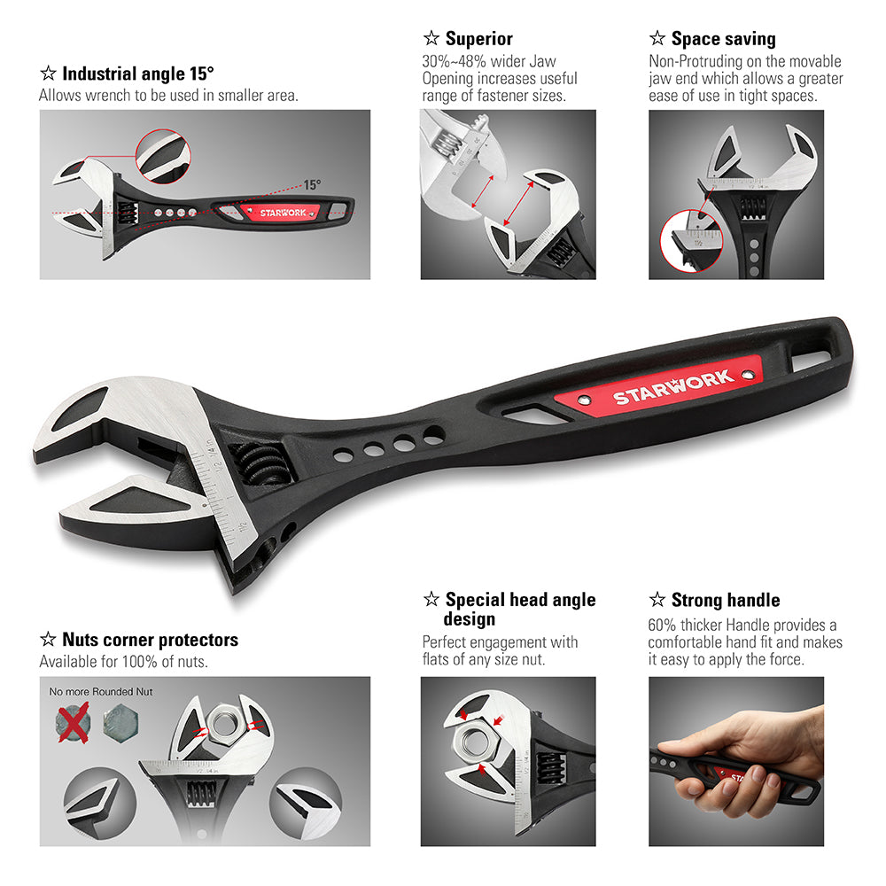 Designed with a 15° industrial head angle and 30%–48% wider jaw opening, featuring nut corner protectors, special head angle for precise engagement, non-protruding jaw for space saving, and a 60% thicker ergonomic handle for secure grip and efficient force application.