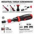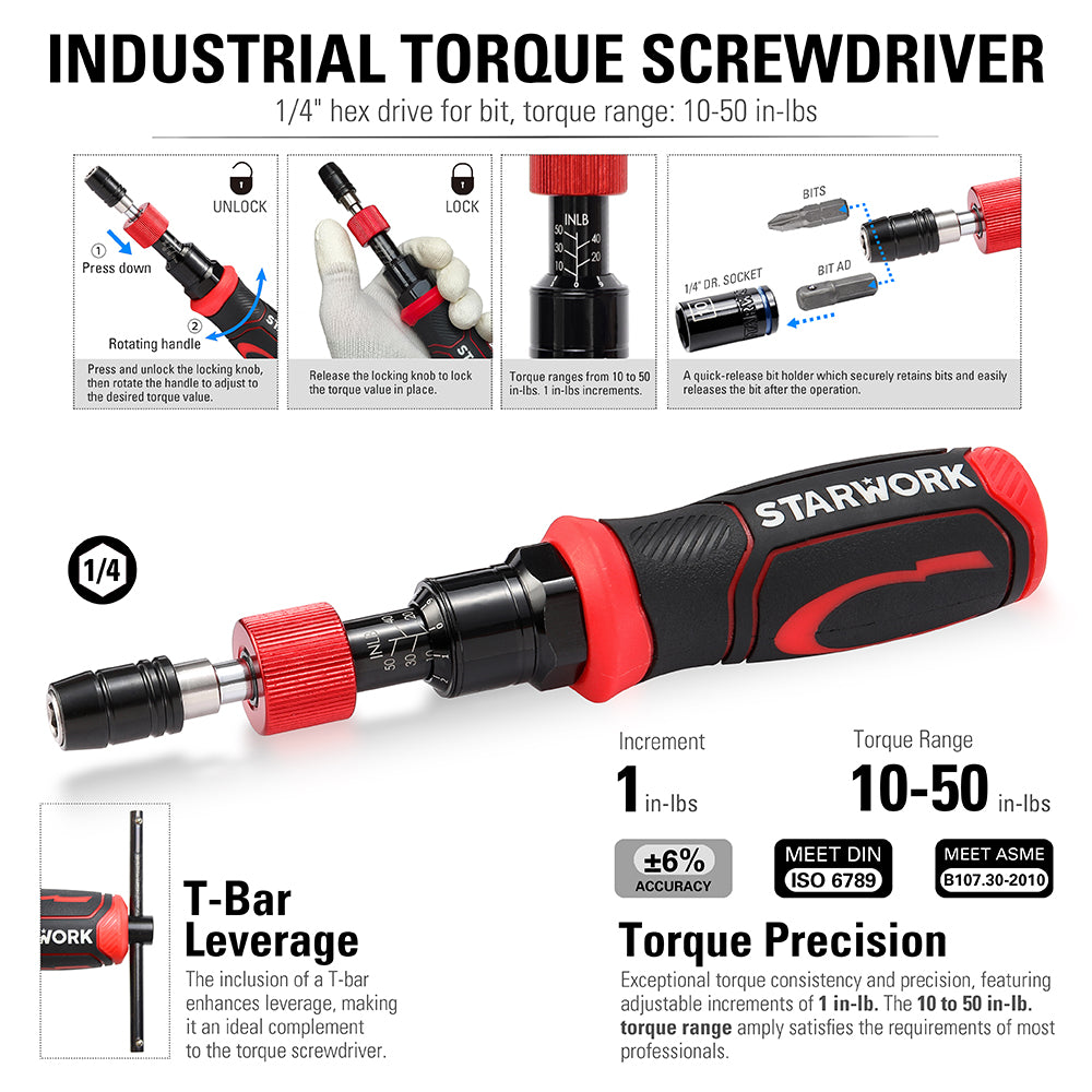 Professional torque screwdriver with 1/4" hex drive, 10–50 in-lbs adjustable range in precise 1 in-lb increments, delivering ±6% accuracy with a quick-release bit holder and T-bar leverage for efficient, consistent, and reliable fastening performance.