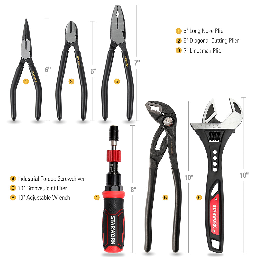 This set included 7" Linesman Plier, 6" Diagonal Cutting Plier, 6" Long Nose Plier, 10" Groove Joint Plier, 1/4" Industrial Torque Screwdriver, 10" Adjustable Wrench, and Multi-Bit Screwdrivers 6-in-1. The functionality is more comprehensive, suitable for use in various situations, included everything you need for mechanic tool, make the job work efficiently.